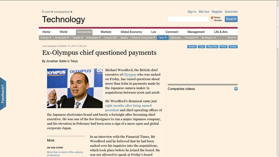 Odwołanie z firmy Olympus jej prezesa Michaela C. Woodforda wstrząsnęło giełdową pozycją firmy, po tym, jak były prezes ogłosił, że część pieniędzy producenta wydawała się po prostu znikać z powodu działalności szefa rady nadzorczej Tsuyoshi Kikukawy. Choć rada Olympusa poinformowała, że Woodford po prostu nie nadawał się do zarządzania dynamiczną korporacją, sam zainteresowany powołuje się na upublicznione przez siebie dokumenty i wyniki zleconej analizy.