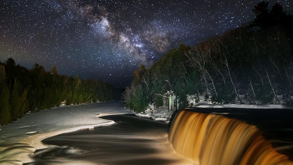 Fotograf Dustin Dilworth z D3 Imagery odwiedził górny wodospad Tahquamenon nocą, żeby uchwycić piękno Drogi Mlecznej. W lesie Górnego Półwyspu Michigan nie ma zanieczyszczenia światłem, dzięki czemu Austin mógł zarejestrować wspaniały spektakl na 45-sekundowym filmie poklatkowym. Poza przemieszczającymi się na niebie gwiazdami, fotograf uchwycił deszcz meteorytów Lyrida.