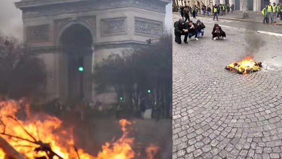 Zestawienie dwóch zdjęć sugeruje, że pożar został sfabrykowany, a widoczne przed Łukiem Triumfalnym płomienie są efektem odpowiedniej perspektywy. Kiedy zdjęcia są obok siebie wydawać się może, że pokazują one tą samą scenę.