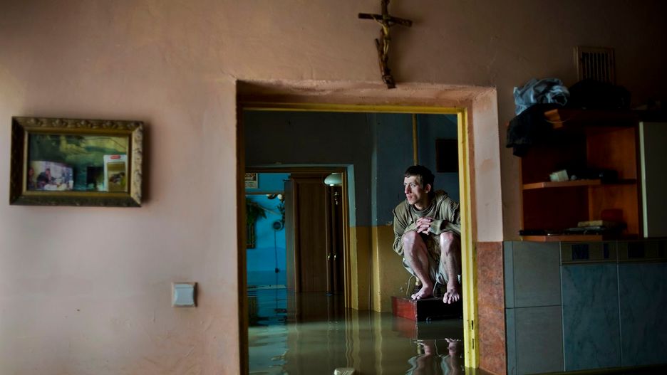 Kiedy już wracaliśmy w stronę suchego lądu, zauważyłem podwórko - „studnię” z kamienic, na którym kwitło życie, choć wody było po pas. Sąsiedzi pomagali sobie, gotowali jedzenie, zaczęli nas wreszcie zapraszać. Weszliśmy do jednego z domów, w którym mieszkanie parterowe zostało zalane. Cała rodzina przeniosła się do sąsiadów, piętro wyżej, a na dole został ojciec – człowiek, którego widzimy na zdjęciu. Porozmawiał z nami chwilę, a w końcu przysiadł na liczniku gazu i zapalił papierosa (gaz był oczywiście odcięty). Udało mi się sfotografować go, kiedy w zamyślonej, a może zrezygnowanej pozie patrzył w jedyne źródło światła – drzwi wejściowe.