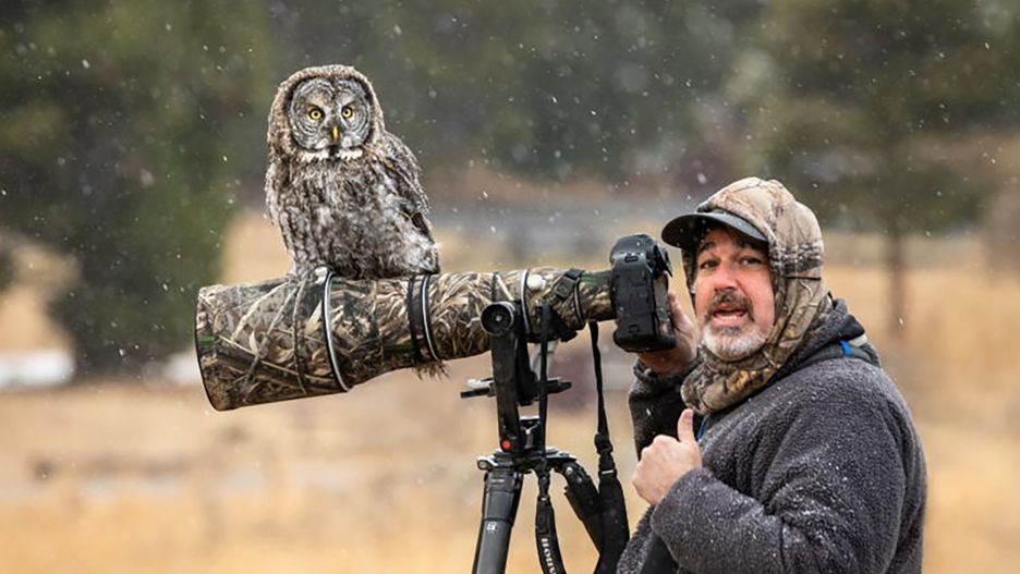 Gdy fotograf obserwował zwierzę, zrobiło mu się zimno. Był to czas na chwilę przerwy i ubranie kamuflażu. Zanim się obejrzał, sporej wielkości puszczyk wylądował na jego głowie! Po chwili ptak przesiadł się na obiektyw, który imitował gałąź. Fotograf powolutku obrócił cały zestaw tak, by jego kolega Beaumon Day mógł strzelić mu pamiątkową fotkę. Takie coś nie zdarza się często!