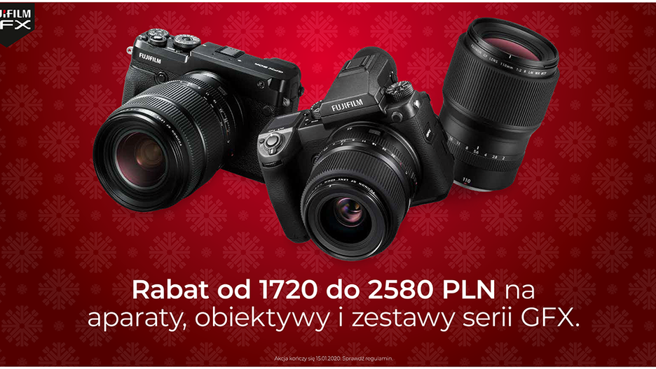 W dniach 15 października 2019 – 15 stycznia 2020, Fujifilm prowadzi akcję rabatową na aparaty GFX i obiektywy Fujinon GF. Klient otrzyma upust w momencie dokonywania zakupu, przy kasie. Lista sprzętu objętego promocją oraz wysokość rabatu znajdują się tabeli prezentowanej poniżej. Promocja dostępna jest w następujących sklepach/sieciach: