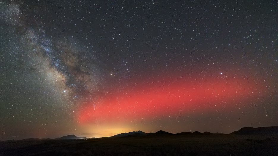 Jeremy Perez uchwycił czerwoną poświatę w górnej atmosferze 19 lipca 2023 r., gdy przechodziła przez nią rakieta SpaceX o nazwie Falcon 9. Barwna aura powstała wskutek wyrzucenia do atmosfery gazów z modułu kosmicznego przy przechodzeniu przez jonosferę.