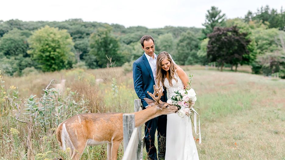 Laurenda Marie, fotografka z pięcioletnim stażem, zabrała parę młodą na krótką sesję w dniu ich wesela. Choć sesja wygląda na starannie zaplanowaną, pojawienie się rogatego modela na zdjęciu było czystym przypadkiem. Przyjacielski jeleń zainteresował się bukietem panny młodej.