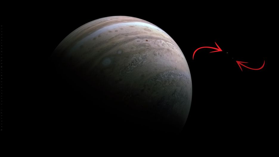 Fotografia przedstawia południową półkulę Jowisza, do której dołącza najbardziej chaotyczne i wulkaniczne ciało astralne Układu Słonecznego nazwane Io, a także pobliska Europa skrywająca globalny ocean ciekłej wody pod lodową powierzchnią.