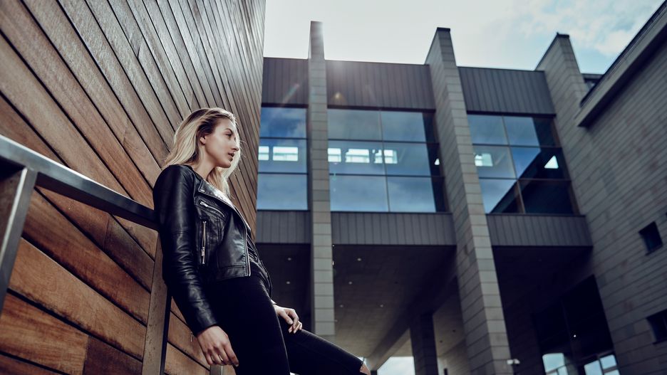 Na kolejnych zdjęciach znów skorzystałem z dwóch lamp. Tym razem filtr pomarańczowy zastąpiłem zielononiebieskim, który dopełnił nieco chłodne kadry, a całość dodatkowo wzmocniłem odpowiednią obróbką. Chciałem podkreślić blond włosy Kingi i błyszczącą, skórzaną kurtkę. Tu znów musiałem wrócić do ustawień manualnych w lampach. Główna błyskała z połową mocy, natomiast kontra z 1/4. Dzięki takiemu ustawieniu odciąłem modelkę od tła, a kolorowy filtr dodał klimatu zdjęciom.