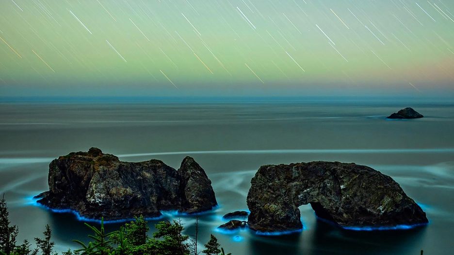 Zdjęcia z wybrzeży Oregonu (USA) pokazują przepiękne zjawisko. Łuki skalne, które tam są, mają dookoła niebieską poświatę, która promieniuje w nocy. Jest to spowodowane bioluminescencją alg. Przyjrzyjmy się temu bliżej.