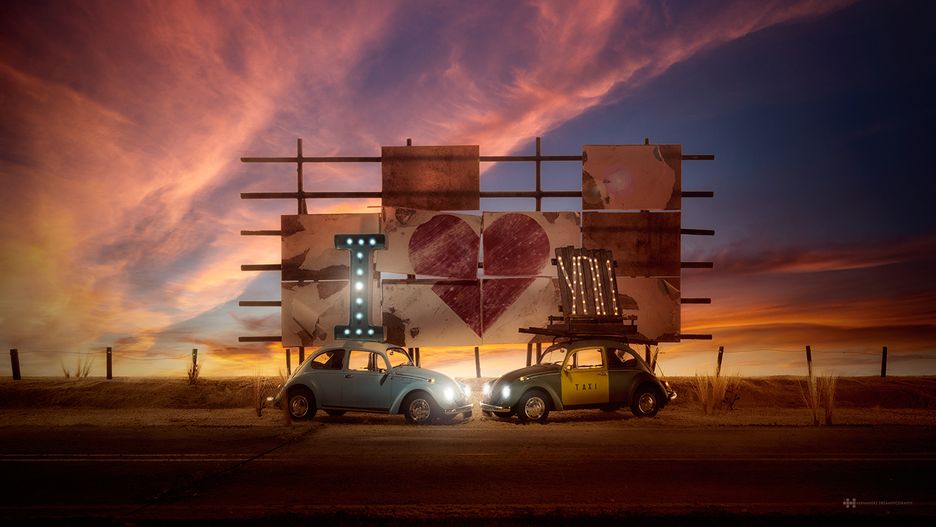 Hernandez sam zbudował całą scenerię – drogę i znaki. Do końcowych montaży wykorzystał zdjęcia swojego autorstwa, czyli m.in. chmury. Zanim jednak przystąpił do fotografowania miniaturowego świata, przygotował odpowiednio modele – oba samochody mają autorskie malowanie i detale.
