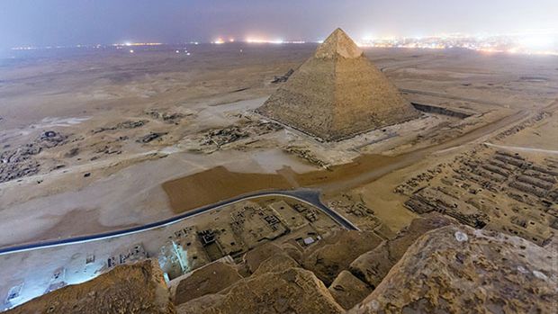 Piramidy są dostępne dla turystów w określonych godzinach, więc po zamknięciu bram ekipa fotografów przyczaiła się w pobliżu, ukrywając się przed ochroną. Mieli sporo do stracenia, ponieważ za nielegalne wspinanie się na piramidy grozi kara więzienia (nie wspominając o gniewie faraonów). Oczekiwanie na właściwy moment trwało pięć godzin – wreszcie jednak udało się rozpocząć wspinaczkę.