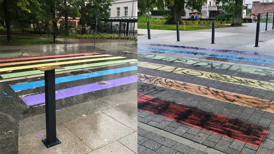 Zanim jednak doszło do ponownego namalowania białych pasów, doszło do aktu agresji wymierzonej w kolorową formę. Ktoś próbował częściowo zamalować pasy czarnym sprayem. Pojawiły się napisy "STOP LGBT" i inne, które obrażały w wulgarny sposób społeczność LGBTQ+.