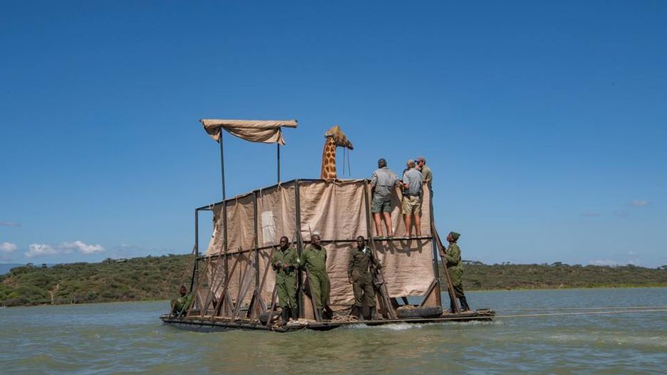 Specjalnie przystosowana tratwa posłużyła do przetransportowania dwóch z ośmiu żyraf ugandyjskich, które utknęły na wyspie Longicharo na jeziorze Baringo. Zwierzęta zostały odcięte od lądu za sprawą niespodziewanego podniesienia się poziomu wód.
