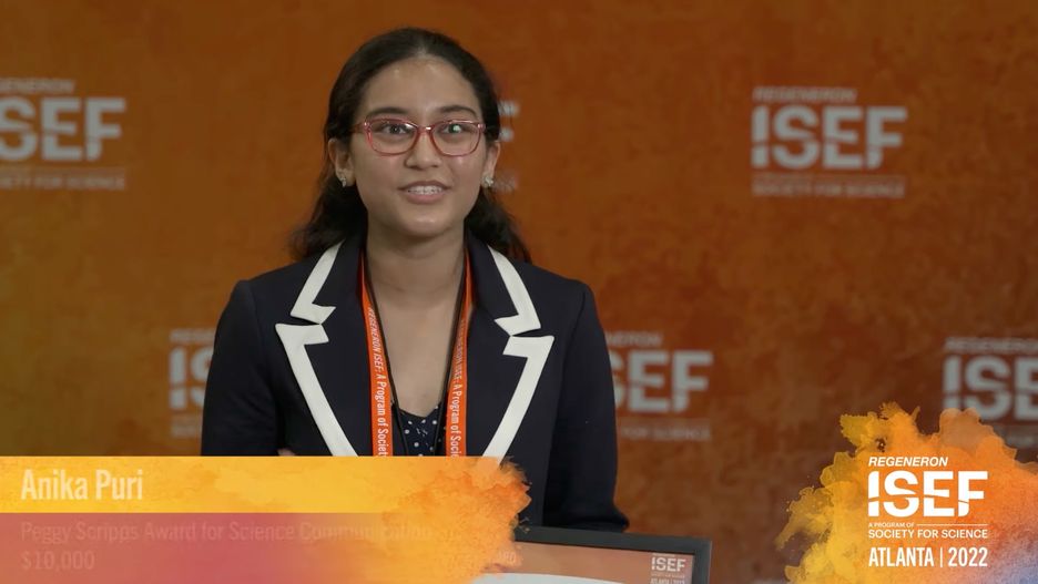 Meet Anika Puri, winner of the 2022 Peggy Scripps Award for Science Communication (Regeneron ISEF)