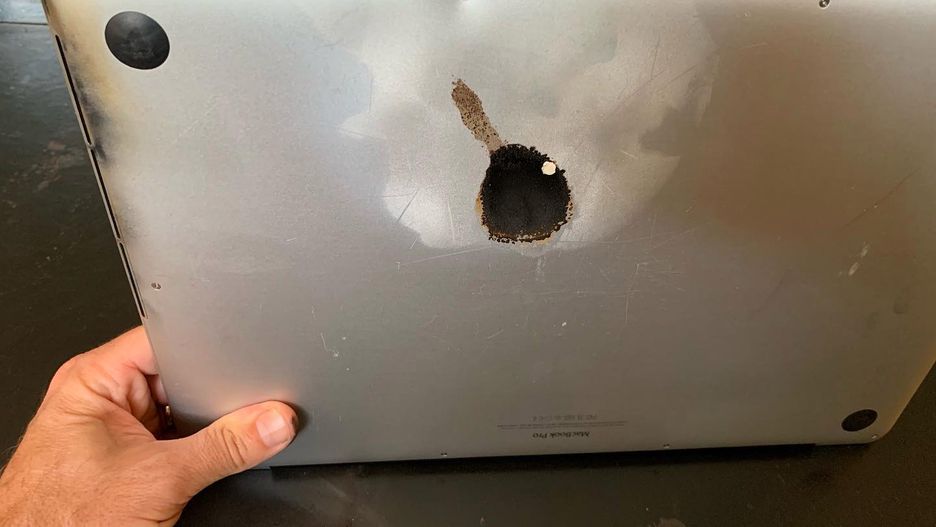 20 czerwca 2019 roku firma Apple otrzymała zgłoszenie od Steve’a, którego bateria wybuchła 17 czerwca. Mężczyzna opisał wszystko na Facebooku i wrzucił zdjęcia. Jeśli myślicie, że to nic poważnego, popatrzcie na tę dziurę. Na pewno nie chcielibyście, by coś takiego stało się, gdy trzymacie komputer na kolanach i pracujecie.