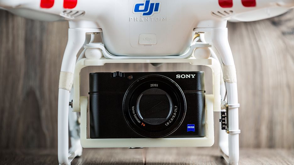 Tyle informacji wstępnych. Teraz nasz pomysł. Dostaliśmy do testów nowiutki aparat Sony RX100 Mark IV. Na początku najbardziej zainteresowała nas możliwość kręcenia filmów w slow motion – do 1000 klatek na sekundę. Potem jednak doszliśmy do wniosku: skoro mamy tak lekki aparat o tak dużych możliwościach, to dlaczego nie zawiesić go pod dronem? Sprawdziliśmy czy istnieje jakiś rozsądny uchwyt na taki aparat na rynku i ku naszemu zaskoczeniu nie znaleźliśmy nic godnego uwagi. Najważniejsze jest by w takim momencie się nie poddać. Skoro produkt nie istnieje, trzeba do wykonać samemu. Ale jak? Szukając w internecie podpowiedzi, natknęliśmy się na stronę z projektami do wydruku 3D. Znaleźliśmy to: