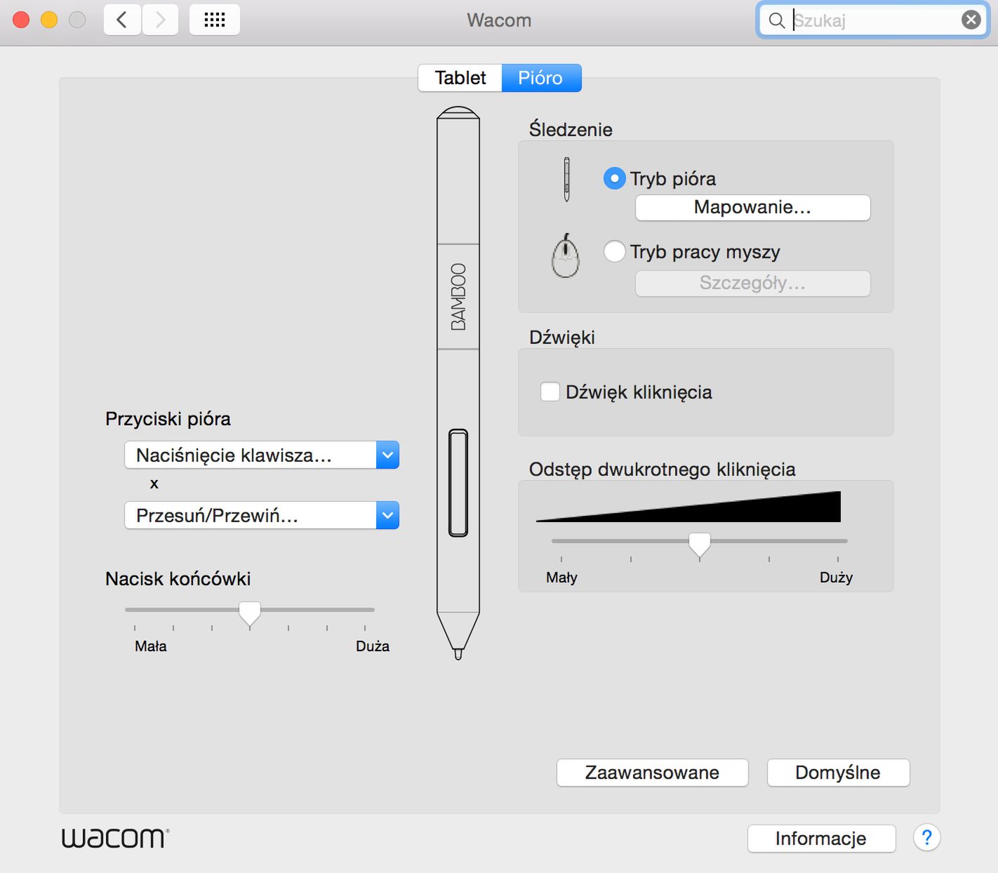 Muszę przyznać, że One by Wacom zrobił na mnie bardzo pozytywne wrażenie. W preferencjach systemowych mamy możliwość zmiany podstawowych parametrów takich jak ustawienie dla osób prawo/leworęcznych, regulacja nacisku piórka czy programowanie przycisków. Nie ma zaawansowanych opcji znanych z Intuosów czy Cintiq, ale do podstawowej pracy w zupełności wystarczą. Ja od razu zaprogramowałem zmianę koloru (przycisk x) i zmianę narzędzi D&B (shift + O). Co prawda trzeba wspomagać się klawiaturą, ale nie jest to w żaden sposób uciążliwe.