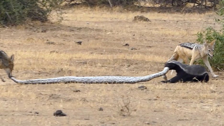 Walka między pytonem, ratelem i szakalami. Dość niespotykane zjawisko na zdjęciach