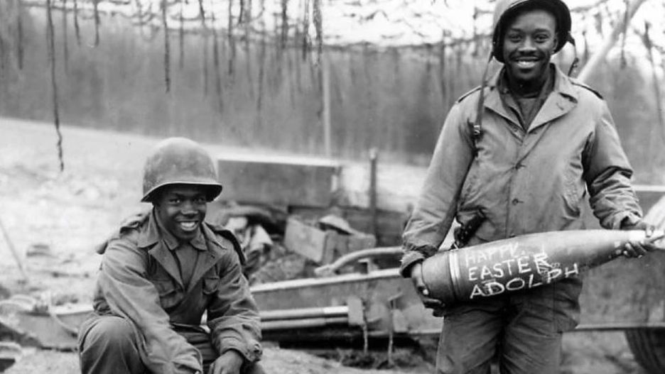 Wesołych Świąt Wielkanocnych, Adolfie! – taki napis znalazł się na pocisku trzymanym przez szeregowca Josepha Jacksona z 333. batalionu artylerii polowej. Obok niego widać kolegę z oddziału, sierżanta technicznego Williama E. Thomasa z koszykiem wypełnionym innymi pisankami tego rodzaju.
