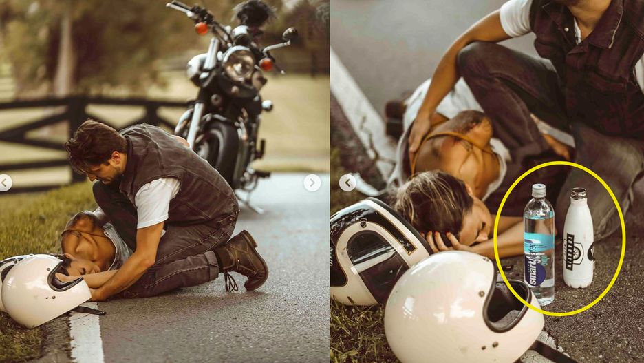 Atrakcyjna kobieta leży na poboczu drogi, obok niej klęczy przystojny mężczyzna. W tle stoi zaparkowany motocykl. W pobliżu leżą dwa kaski. Ostrość znajduje się na postawionej logo do przodu butelce wody. Kto i po co miałby robić takie zdjęcia, obrabiać je, a następnie wrzucać na Instagrama?