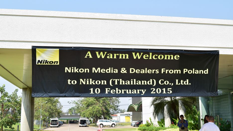Po dojechaniu na miejsce przywitał nas baner, natomiast zaraz za drzwiami recepcji czekała na nas załoga pracowników administracyjnych oraz zarząd fabryki. Wcześniej mieliśmy okazję poznać również prezesa Nikon Europe. Przy wejściu do holu zostaliśmy poproszeni o zmianę obuwia na śmieszne, skórzane kapcie a następnie zostaliśmy obdarowani kwiatami i kieliszkami ze słodkim napojem. Miłym gestem było kilkukrotne przywitanie pracowników z charakterystycznym złożeniem dłoni i ukłonem. Taki sposób powitania to jedna z najmilszych rzeczy, której doświadczyłem w Tajlandii w wielu miejscach.