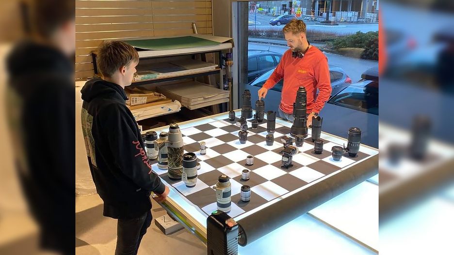 Sklep Stavanger Foto znajduje się w norweskim mieście Stavanger. Na swoim wyposażeniu ma nie tylko przegląd przez róże lampy błyskowe, telekonwertery, obiektywy czy lustrzanki cyfrowe, ale również… wielką planszę do gry w szachy! W postaci figur znajdziecie tam różnej maści sprzęt. Jak się domyślacie – w roli króla są ogromne teleobiektywy.
