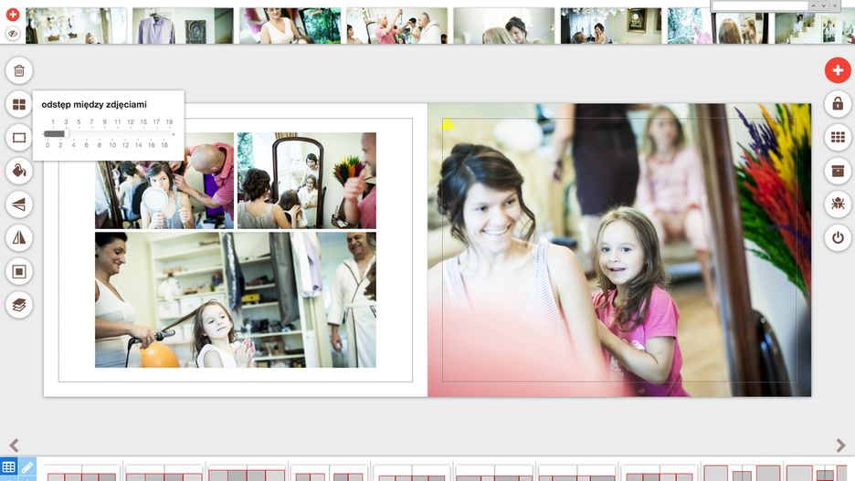 Po prawej stronie umieszczono kolejnych 6 ikon. Pierwsza służy do dodawania rozkładówek. Druga przenosi nas w tryb ręcznej edycji. Po przejściu w ten tryb, klikając w konkretne zdjęcie ułożone już na rozkładówce, możemy je powiększyć w ramach pola, które już zajmuje, powiększyć je w całości, odbić lustrzanie lewo/prawo, usunąć z rozkładówki, zmienić położenie w hierarchii warstw (przenieść na samą górę, wyżej, niżej, na sam dół), przenieść bądź zamienić z innym w ramach tej samej rozkładówki.