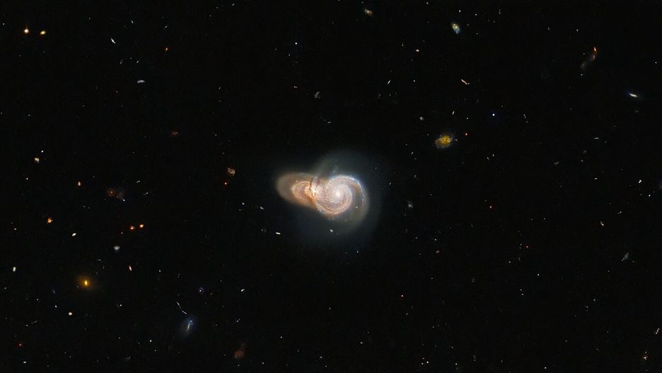 Złudzenie to zasługa perspektywy – jedna z galaktyk jest bliżej, a druga dalej, więc są w jednej linii. Na dodatek ramiona tej bliższej mają znaczą przepuszczalność, przez co wydaje się, jakby obie galaktyki się splatały. Co ciekawe – znajdują się one ponad miliard lat świetlnych od Ziemi.