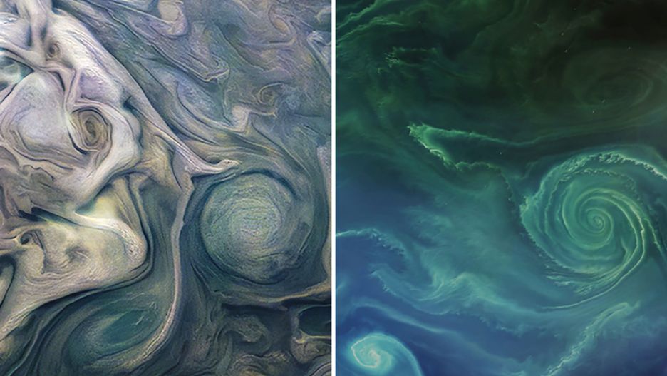 Wydawać by się mogło, że ta odległa planeta nie ma nic wspólnego z Ziemią. Jeśli tak myślicie, zmienicie zdanie patrząc na zestawienie dwóch zdjęć, które pojawiło się ostatnio na stronie NASA Earth Observatory. Okazuje się, że prawa fizyki decydujące o ruchu płynów są takie same dla obu planet. Wiry na Ziemi nie różnią się od tych na Jowiszu.