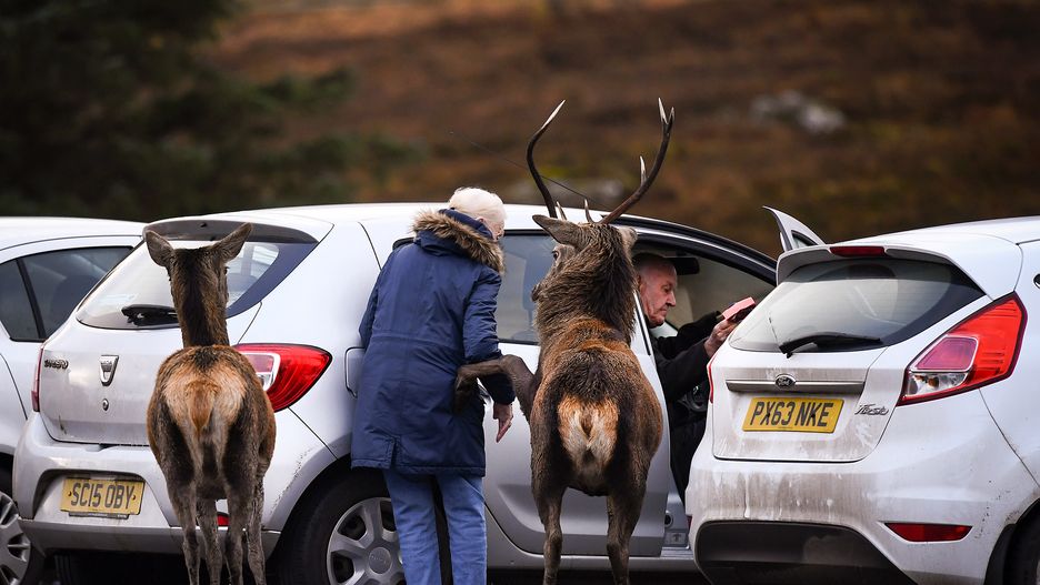 Nietypowa scena miała miejsce w szkockich górach w okolicy pasma Glen Etive. Grupa jeleni zbliżyła się do turystów, a jeden z nich wyciągnął swoje kopyto do starszej pani, która chciała wejść do swojego samochodu.
