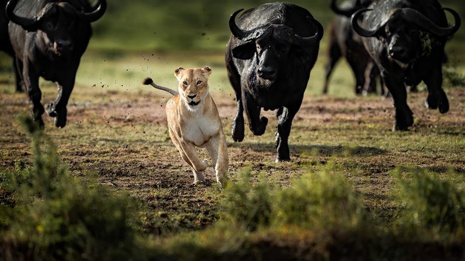 Zgodnie z relacją autora zdjęcia, samica w centrum kadru jest członkinią stada, które przymierzało się do ataku na grupę bawołów. Gdy lwica zbliżyła się za bardzo, bydło ruszyło na nią. Pokazuje to, jak dobry słuch i jak czujne są bawoły afrykańskie w każdej chwili. Wystarczy bardzo mały powód, by zwierzęta zaatakowały lub uciekły. Wyobraźcie sobie, co by się stało, gdyby lwica się potknęła. Jeśli pamiętacie scenę z antylopami w Królu Lwie, bez problemu z wizualizujecie sobie sytuację, w której było to piękne zwierzę.