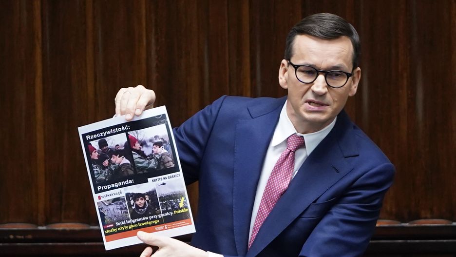 Podczas swojego wystąpienia, premier Mateusz Morawiecki wyciągnął wydruki zrzutów ekranów z mediów. Na górze pod napisem rzeczywistość znajdują się kadry z kontrowersyjnego filmu pokazującego wywoływanie łez u jednego z dzieci w obozie migrantów. Na dole, pod napisem propaganda, montaż zdjęć prasowych z portalu wyborcza.pl z tytułem: Setki imigrantów przy granicy. Polskie służby użyły gazu łzawiącego. Artykuł Wyborczej odnosił się do faktycznej sytuacji, w której straż graniczna użyła gazu łzawiącego, lecz nie przeciwko dzieciom, a dorosłym osobom. Według premiera wykorzystanie w kolażu zdjęcia dziecka było nie na miejscu.