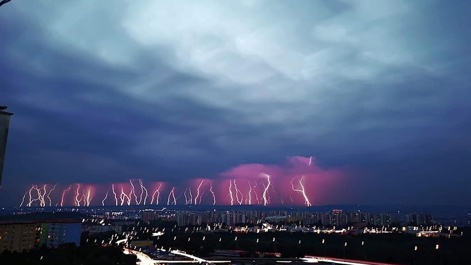 Mężczyzna skorzystał z opcji długiego naświetlania, dzięki czemu trwające ułamek sekundy błyskawice zostawiły swój ślad na zdjęciu. W miejskim krajobrazie Brna widać konkretny obszar, nad którym szalała burza. Pioruny wyglądają tam zjawiskowo – zwłaszcza przez charakterystyczny odcień różu.