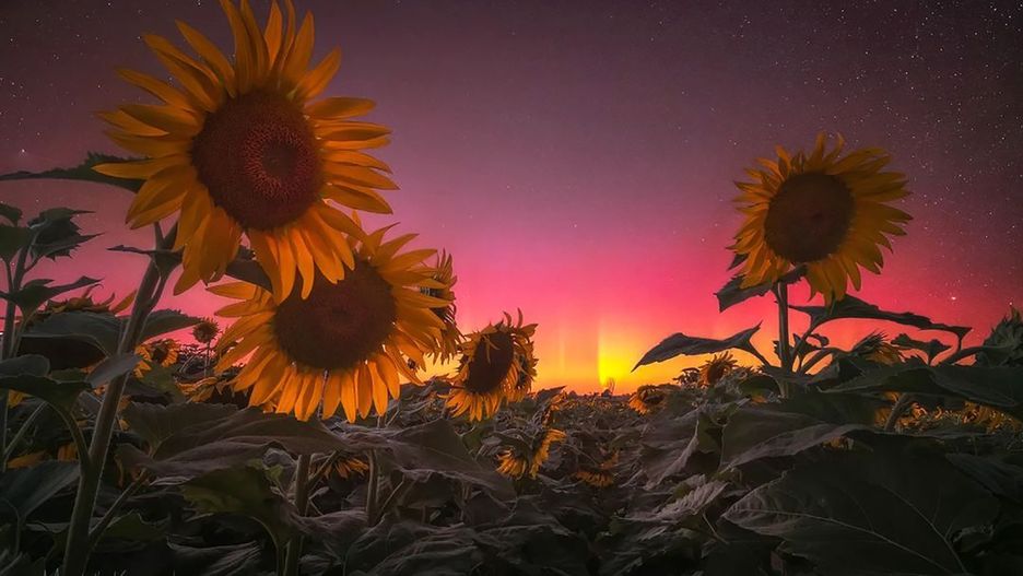 MaryBeth Kiczenski sfotografowała pole słoneczników w stanie Michigan. Na kilku zdjęciach zobaczymy przepiękne fioletowe filary zorzy polarnej, a na niektórych wielobarwne niebo – żółte, czerwone, fioletowe, różowe i granatowe. Takie zjawisko wygląda naprawdę niesamowicie!