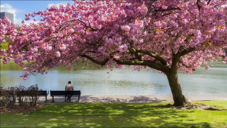 Niestety, było dosyć pochmurno i aleje kwitnących wiśni były jakby pozbawione uroku. Idąc chodnikiem wzdłuż stawu, mijałem majestatyczną, pięknie ukwieconą wiśnię, pod której gałęziami, na ławce, siedział nieruchomo mężczyzna w płaszczu. Wyciągnąłem aparat, w tym samym momencie słońce wyszło zza chmur i oświetliło park. Wiśnia jakby od razu nabrała życia. Intensywność koloru kwiatów była powalająca. Ustawiłem kadr i strzeliłem zdjęcie, chwilę potem dla pewności jeszcze jedno. Opuściłem aparat, aby rozkoszować się widokiem. Wówczas słońce znowu się schowało za chmury. Człowiek siedzący na ławce wstał i odszedł. Spektakl szybko się zaczął i równie szybko skończył. Pozostało zdjęcie.